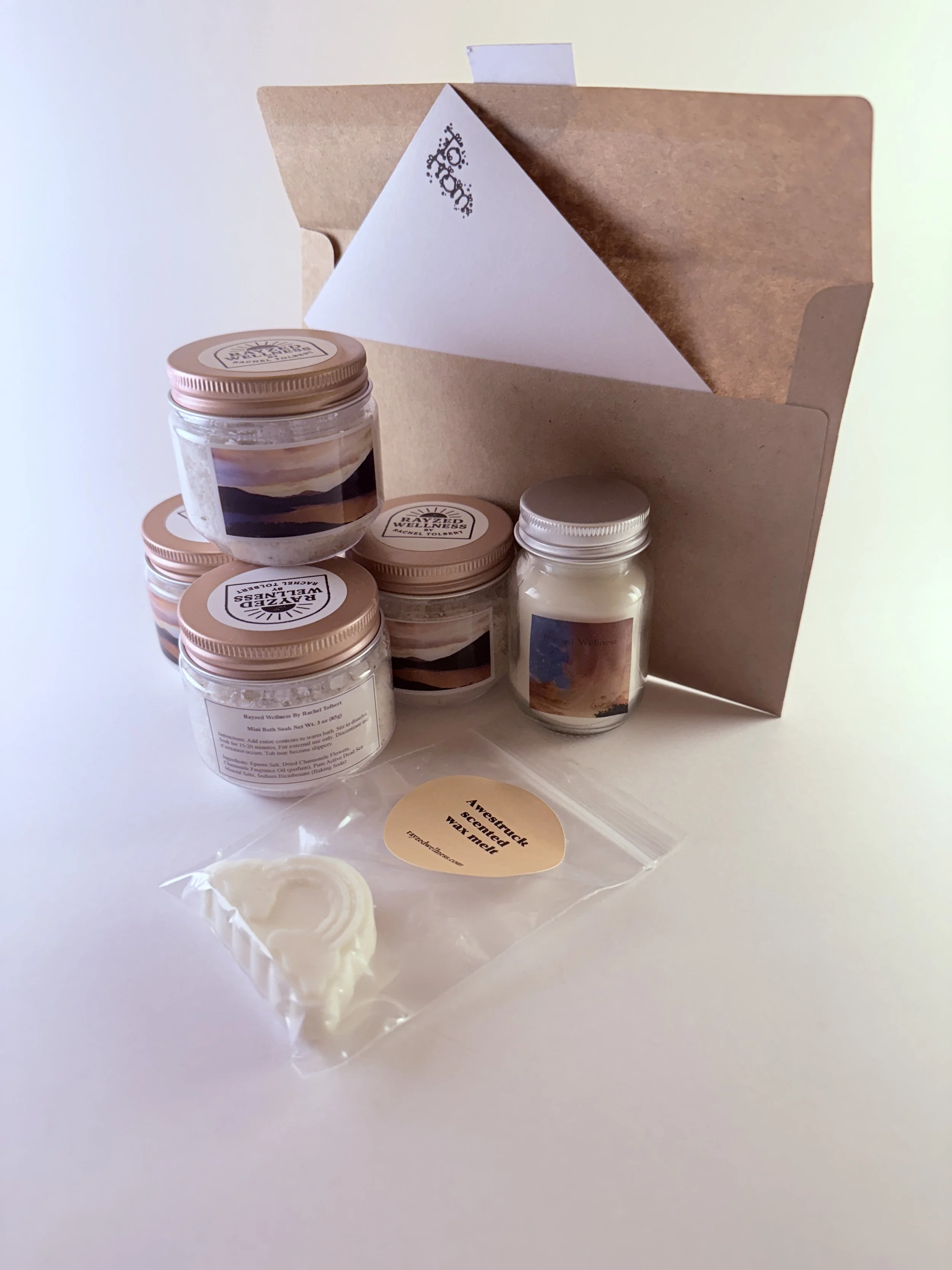 - Two Bath Soaks (3 oz each) - handcrafted with Epsom salt, Dead Sea salt, chamomile and sodium bicarbonate to ease tension and promote deep relaxation.